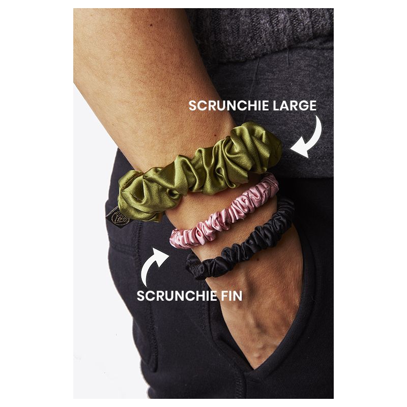 Le Gentle Kiss est un scrunchie Large en 100 % soie de mûrier qui attache les cheveux en douceur, sans tirer ni fragiliser la fibre capillaire.
