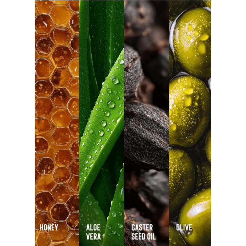 Soin sans rinçage léger et hydratant à base de miel, aloe vera, huile d’olive et huile de ricin.